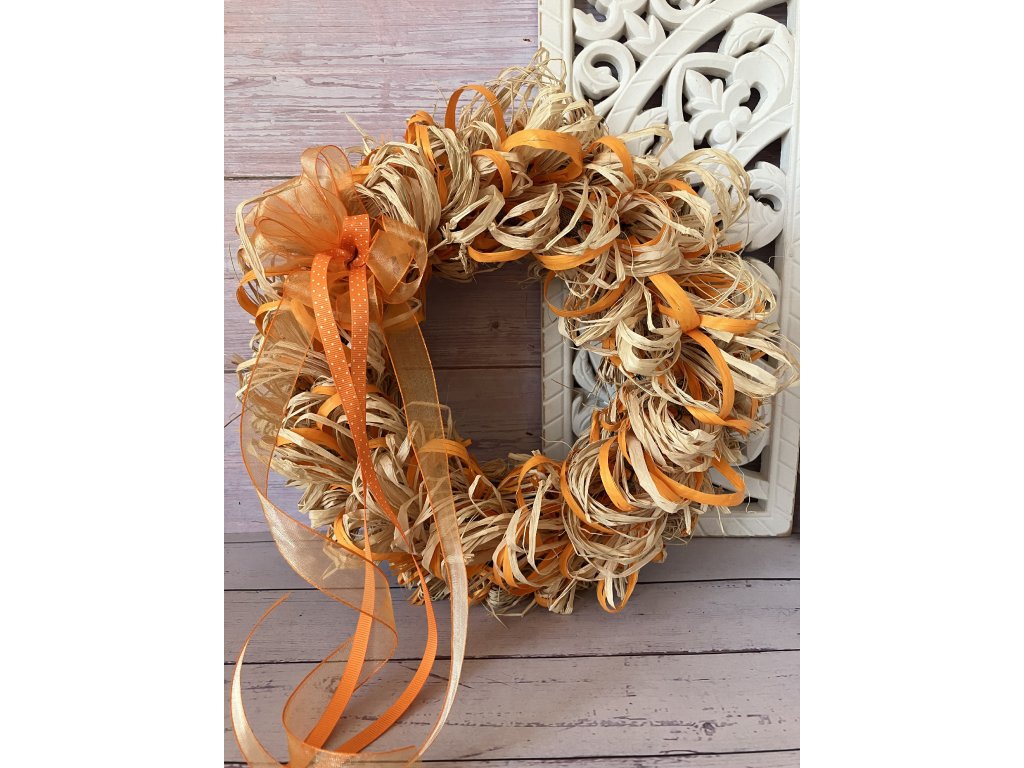 Střápatý podzimní věnec vyroben z lýka a barvené rafie, jednoduše kombinovaný doplněný stuhou. Průměr 32 cm. Trvanlivá dekorace. Skladem 1 ks.