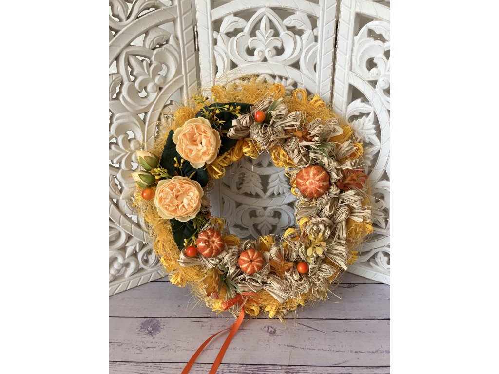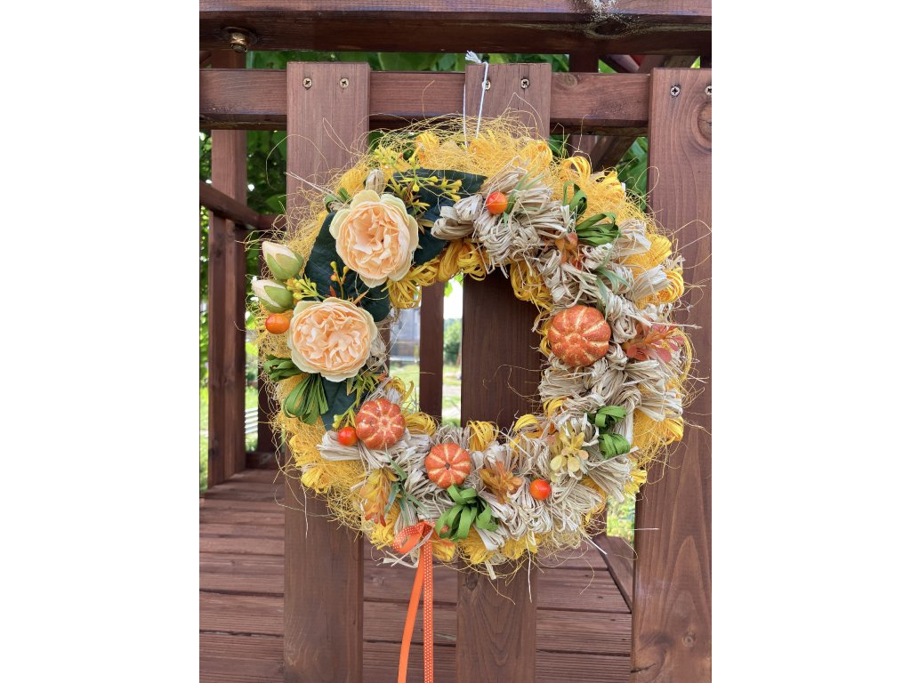 Kouzlo podzimu je v barevnosti, kterou jsme každý rok očarováni, zde jsou zvolené zářivé barvy žlutá a tóny oranžové. Věnec je vyroben ze slámového základu, který je začištěn stuhou, látkovými květy, lýkem, barvenou rafií, dýněmi a bobulkami. Trvanlivá dekorace o průměru cca 32 cm.